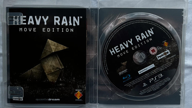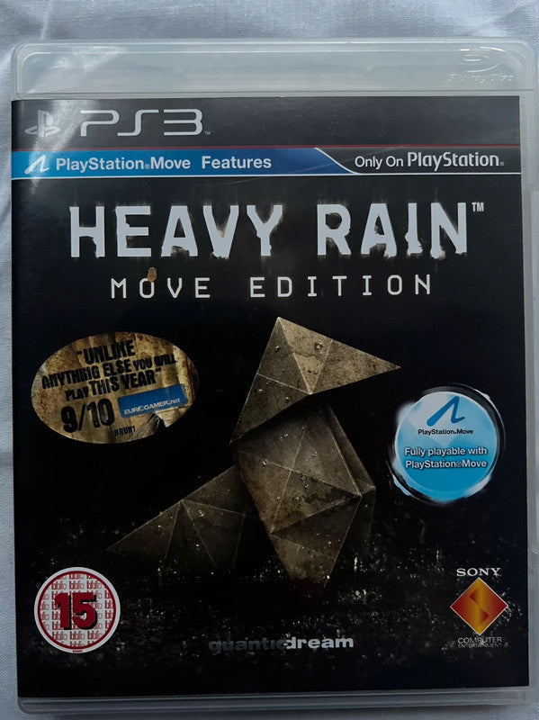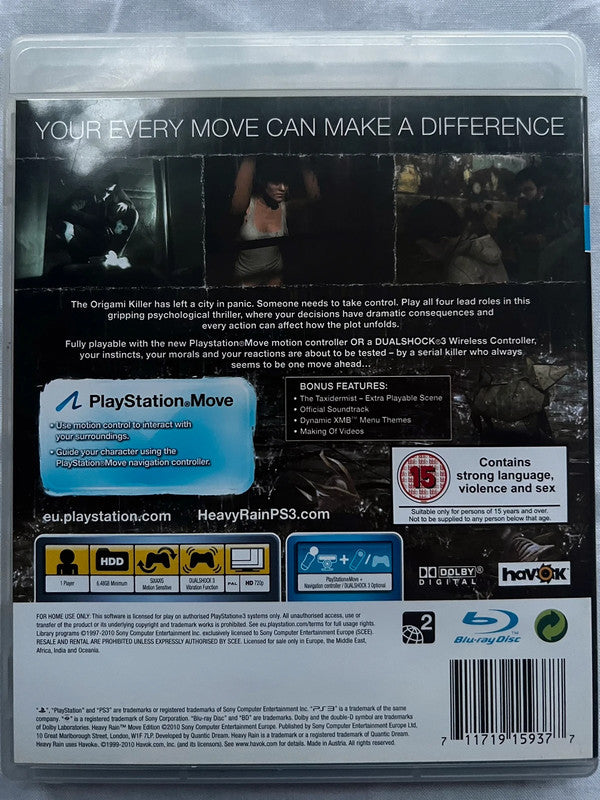 15 + This game is compatible with Playstation Move Includes bonus disc with extra content The critically acclaimed action adventure Heavy Rain has been given a PlayStation Move makeover, making the hunt for the Origami Killer even more involving than before... Heavy Rain is an intense psychological thriller which challenges you to track down a serial killer - play through an emotional, gripping story that combines exploration, dialogue and action, where every decision can have dramatic consequences. Heavy Rain: Move Edition Features: Use PlayStation Move for the ultimate freedom of control as you explore a rich, detailed, action-packed world and interact with a compelling cast. Make decisions in the heat of the moment that will have a tangible impact on the way the plot unfolds and the fates of the characters. Hunt for the Origami Killer in an emotionally driven experience how far will you go to save someone you love? Manufacturer's Description Extras for the Move edition: Full game soundtrack Dynamic themes based around the characters 'Making of' video 'Taxidermist' level, which was available with the special edition at launch, but now comes in the Move sku.