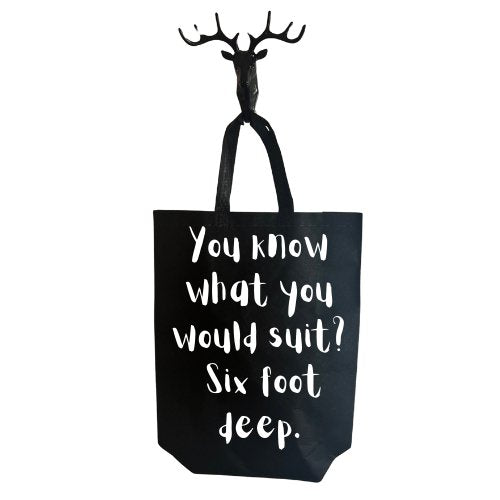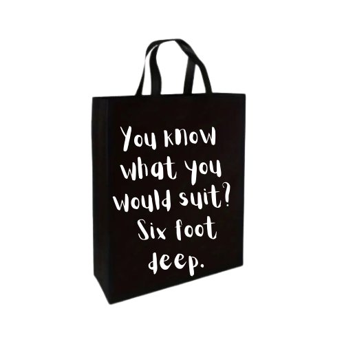Experience the perfect blend of style and humour with our Six Foot Deep Tote Bag. Made with durable black polyester, this tote bag is perfect for shopping and guarantees to stand out with its unique vinyl handmade text. Plus, it's produced with care, so you can expect the highest quality. Get yours today and make a statement!