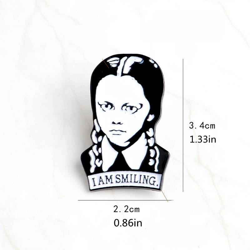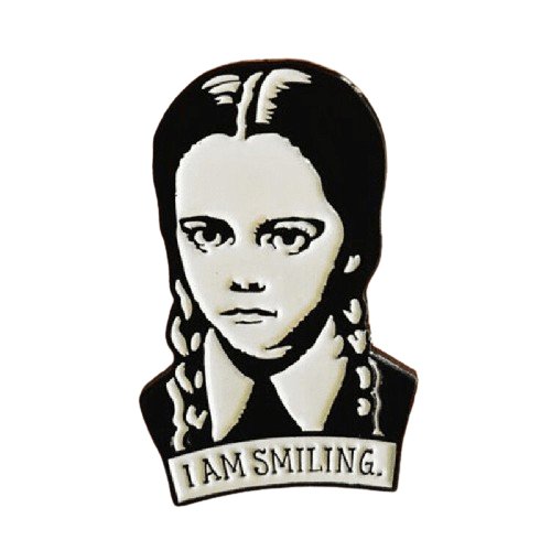 Show off your love for The Addams Family with the Wednesday "I am Smiling" Pin Badge. Perfect for any fan, this 3.4 x 2.2cm badge is the perfect addition to any outfit, making it a must-have accessory. Add a touch of creepy and cute to your style with this lapel badge.