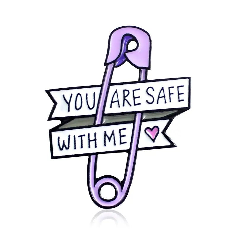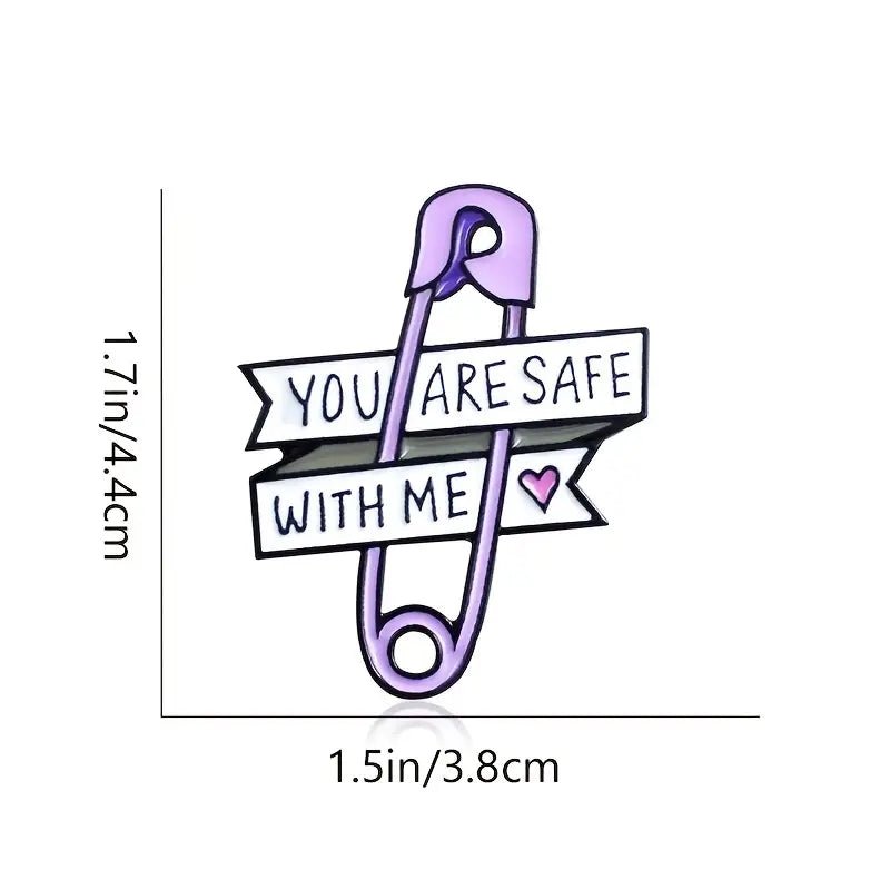 Show off your unique style with the You Are Safe With Me Pin Badge. Its standard clutch clasp ensures it stays securely in place, while its versatile design allows you to easily wear it on jackets, backpacks, hats, and more. Make a statement and express yourself with this stylish and eye-catching accessory.