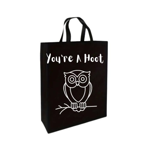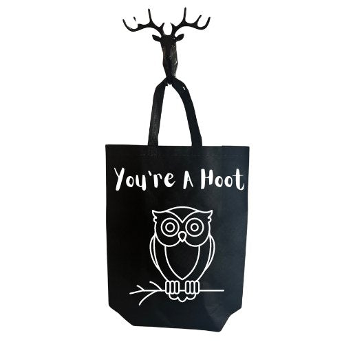 Carry your love for owls with the You're A Hoot Tote Bag. Hand printed in the UK, this black polyester tote features the playful phrase "You're a hoot" and an adorable owl image. Perfect for all owl fans, this bag is both quirky and practical.